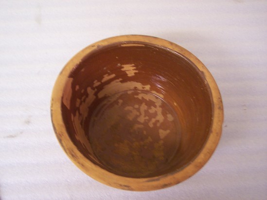 CLEAR GLAZED INTERIOR, UNGLAZED EXTEROR. PLAIN BASE, ROLLED RIM.