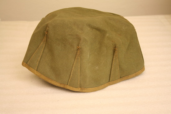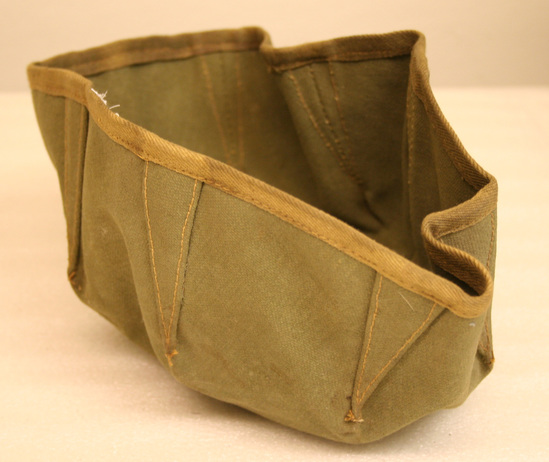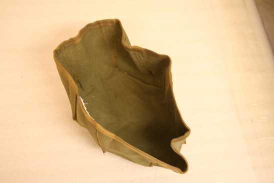 Collapsible wash basin, World War I era. Olive green canvas bowl made by putting 8 darts in a circle, reinforcing them with triangle patches and hemming with twill tape.