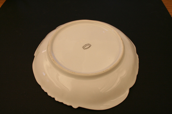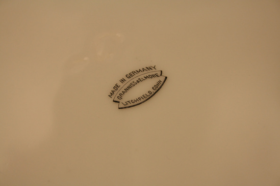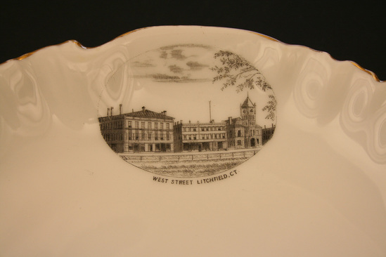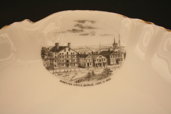 White ceramic serving dish, slightly oval shaped. Uneven edge. Accented with gold line. Leaves and berries in gold on two sides. Two lithograph images on opposite corners of dish. One shows West St. before fire - printed underneath "Mansion House, Burned June 11, 1886" and the other shows same view after rebuilding - printed underneath "West Street Litchfield, CT"