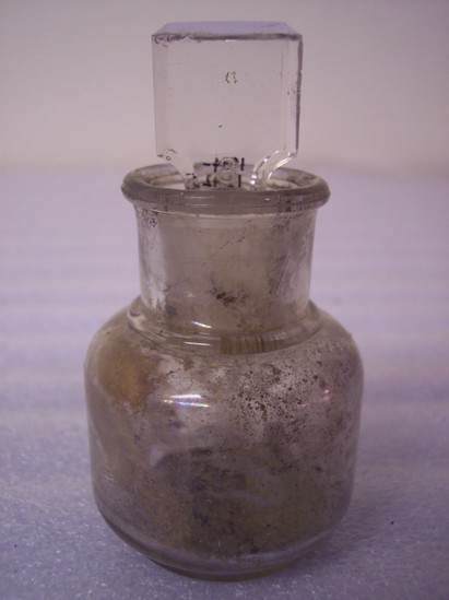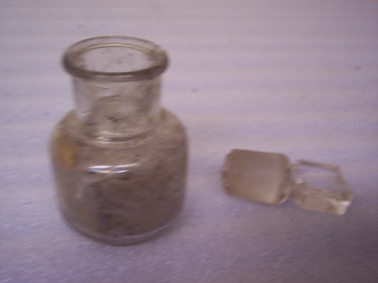 Clear glass bottle with stopper, raised lettering on the bottom "Cowans Cure" and number "8" on the side of the stopper. Remnants of dirt inside - probably excavated in a dig. A: bottle, B: stopper