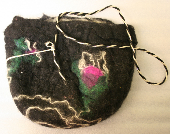Wool felt. Bag shaped (round sloping sides, round bottom) with black and silver twisted polyester handle. Black, with fuscia, green, and white irregular floral decorations. White lining