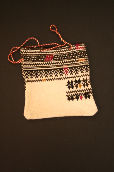 Small purse made of white linen. Design doen in black with accents of red and green. Bands of repeating patterns. The bag is unfinished on one side. Two thin red twisted strings attached at top for handle.