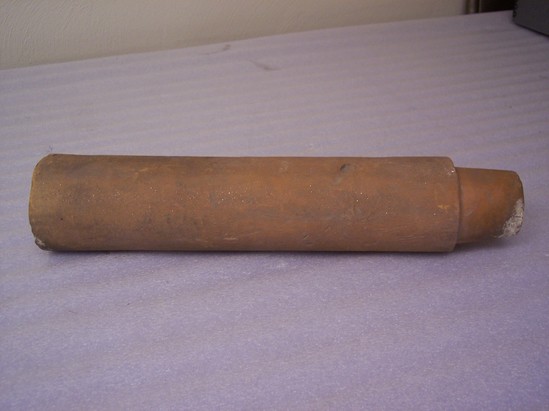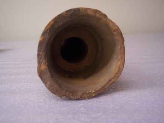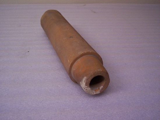 APPARENTLY COMPLETE SECTION OF REDWARE DRAINAGE PIPE. UNGLAZED, WITH ONE END TAPERED TO FIT INTO OTHER PIPES; OPPOSITE END IS FORMED TO HOLD A PIPE.