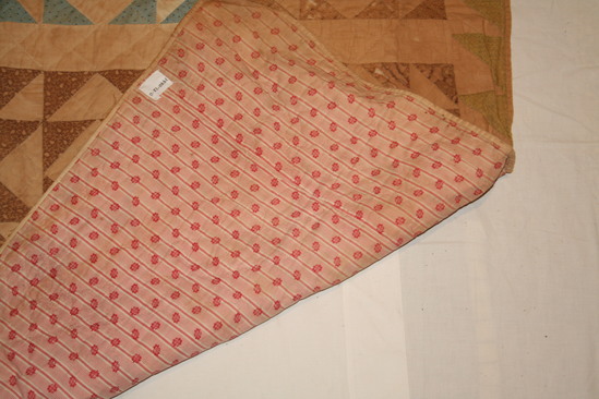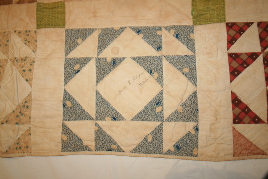 Patchwork quilt, friendship style comprised of 42 patches of alternating printed and white cotton triangles, each one signed in iron gall ink by a different woman from Morris, Litchfield, Northfield, Watertown, Plymouth in CT, and several with Wisconsin. Bound with green and yellow polka dot on brown ground cotton, edge in saw tooth pattern. Backed with red and white stripe printed cotton. Names: (illegible) Benton, Watertown Augusta C. Smith, Northfield Mrs. Lydia Gilbert, Northfield E Gilbert, Northfield Mrs. Maria Loveland, Morris Augusta C. Aumon, Northfield Eliza Bassett, Northfield (illegible) Watertown, Conn Miranda Johnson, Wisconsin J. Loveland, Morris Lucy Ann Russell, Watertown Hannah Hubbard, Watertown Mrs. Martha Loveland, Watertown Bennet Johnson, Northfield Mrs. Maria Woodward, Plymouth Emili Gilbert, Litchfield E (illegible), Watertown (illegible/signature torn) -------- Gilbert, Litchfield Harriett Bassett, Northfield Addie Johnson, Wisconsin Catherine ______, Watertown, Conn Mrs. Bella Seymour, Watertown ________ Barnes, Plymouth Harriet Loveland, Morris Emma Curtis, Watertown Mrs. Fidelia DeForest, Litchfield Sarah Kellogg, Wisconsin _______ Gilbert, Litchfield ____________, Northfield ____________, Watertown, Conn _______ Kilbourn, Watertown _____ Lake, Northfield Willis Loveland, Morris Francis Hichcock, Watertown _______ Johnson, Litchfield Sarah J. DeForest, Litchfield Mrs. Susan Curtiss, Northfield Mrs. Mary Kellogg, Wisconsin Julia E. Chapin, Watertown Mrs. Maria Gilbert, Northfield Orelia Thomas, Plymouth