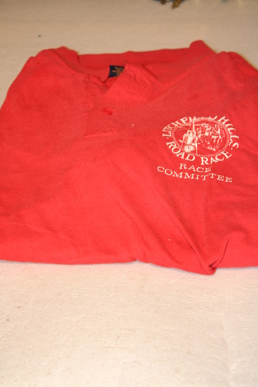 Red short sleeved polo shirt, with two buttons. Logo on front, upper left hand side of shirt, printed in white. Circle with "Litchfield Hills Road Race" printed around outer edge. Runners and a steeple or clock tower inside. "Race Committee" printed underneath logo.