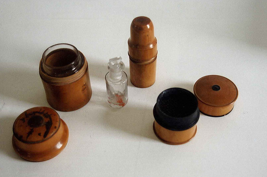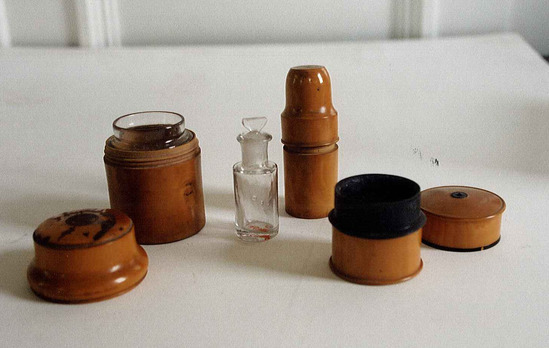 Four fruit wood or boxwood traveling apothecary containers, all of cylindrical forms. A-C: bullet shaped form with screw on top and base, clear glass bottle with stopper inside; D-F: top and bottom screw together, glass jar without lid inside; G-J: Cylindrical base with screw top and rounded lid with screw bottom that tapers to a round handle, glass bottle inside with stopper, both parts labeled "LEOPOLD/FOURNISSEUR DE/S.M. L'EMPEREUR/10 RUE CASTIGLIONE/PARIS"; K-M: rounded screw top (marked "F. TOMES & SONS/NEW YORK"), upper compartment with small rounded glass bowl and screw top and bottom, middle compartment missing glass bowl with screw top and bottom, lower compartment with shallow glass bowl and screw top.