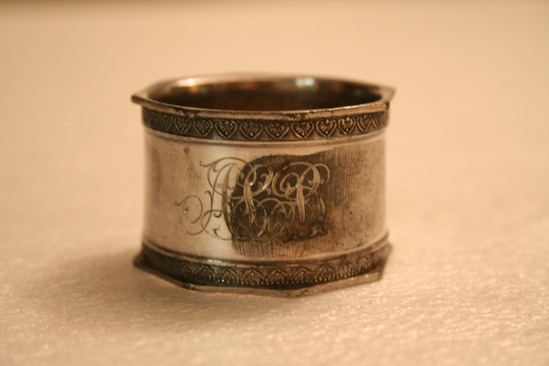 Octagonal shaped napkin ring. Border on top and bottom of repeating acanthus leaf design. Monogrammed "ALP"