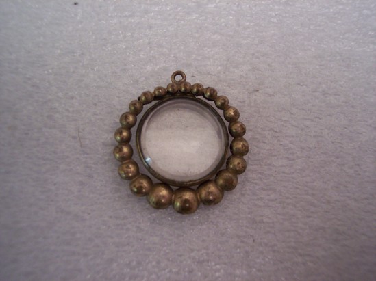 Oval pendant with clear glass center. Encircled by ring of graduated gold balls. Pendant hinged at top, probably contained hair or a miniature at one point.