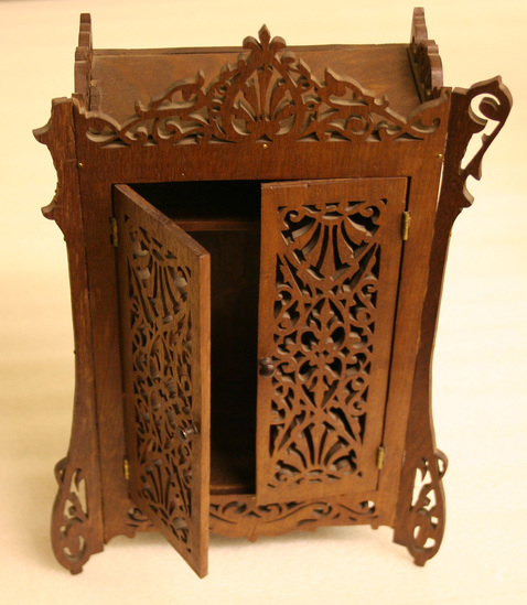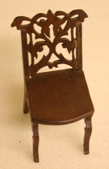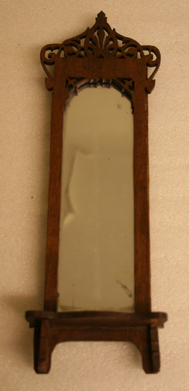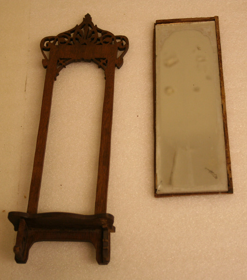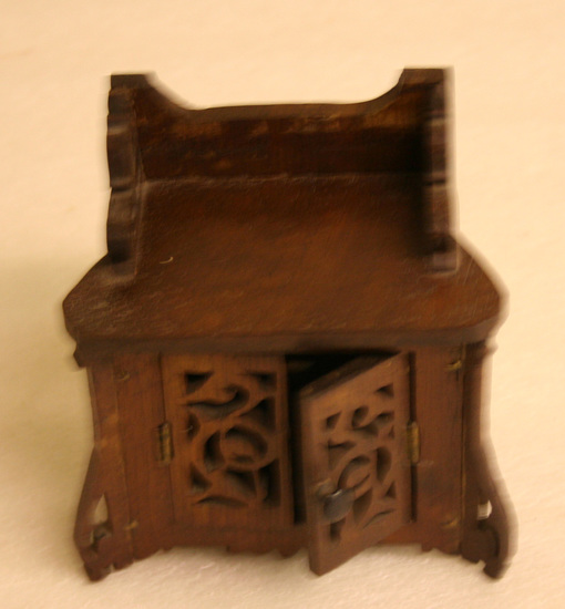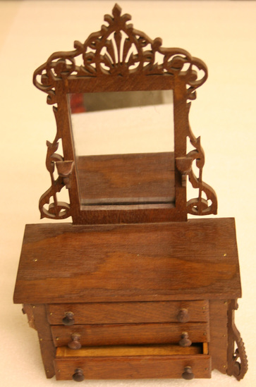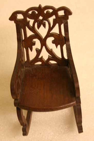 7 pieces of doll furniture A - Wardrobe - 12 1/8" high x 7 3/4" wide x 3 1/4" deep; stained wood; ornate jig saw doors, trim, legs and double door front; shelf and hooks inside, one top corner broken B - Pier glass mirror console - 12 1/2" high x 4 1/4" wide x 1 5/8" deep; stained wood and glass; console with jig saw legs, high mirror with fancy crest; glass not affixed in frame C - Bureau with mirror and 3 drawers - 10 1/2" high x 6 1/2" wide x 3" deep; fancy legs and mirror frame with shelves D - Side Chair - 4 1/4" high x 2" wide x 2 1/2" deep; fancy back and side pieces E - Rocking Chair - 4 1/2" high x 2 3/4" wide x 4" deep; fancy back and side pieces F - Round Table - 4" diameter x 3 3/4" high - cross piece base of cut pieces; inlay top G - Commode chest/stand - 4 3/8" high x 4" wide x 2 1/8" deep - 2 fancy doors and carved back rail at top