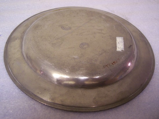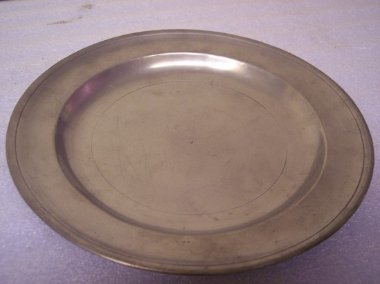 Pewter plate, single reeded rim, reed in bottom, two marks on back - "Boardman & Co. New York" in circle around eagle, stamped twice on back of plate