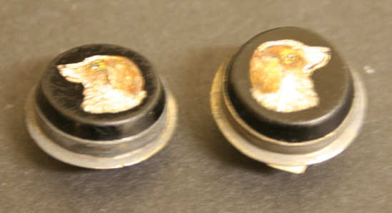 Pair of round cuff links. Round black stones with inlaid micro-mosaic design of dog's head made of white and brown stones. High silver collar holds sloping sides of black stone. Bar across back of with mushroom shaped stud with V noticed into it.