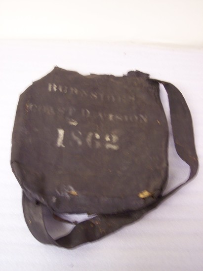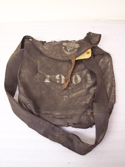 Canvas haversack painted black. Haversack has long shoulder strap and lip which attaches to body of bag with leather and metal buckle. Painted on lid is an image of an anchor and a cannon (in white paint) On body of bag in white paint "1901" On back of bag in white paint "Burnsides/Coast Division/ 1862"