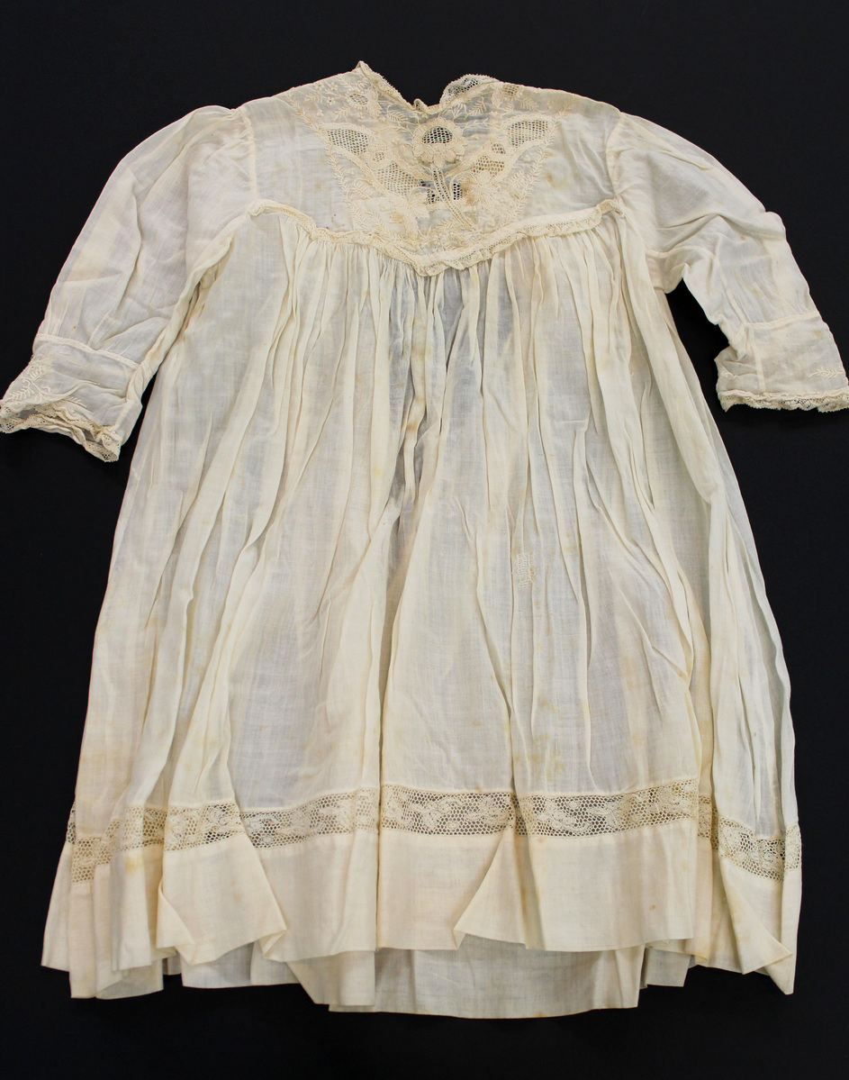 White cotton child's dress; panel across chest with white work and drawn work embroidery; lace trim around neckline; dress gathered along V shaped bottom of chest panel; long sleeves with cinched cuff with white work and drawn work embroidery; inserted band of lace work above hem; mother of pearl buttons at center back