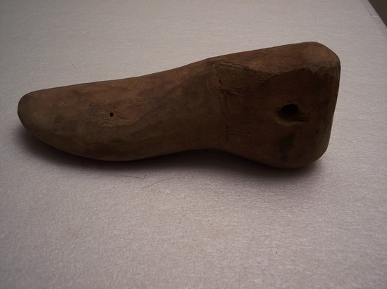 Mold of a shoe - made of wood. Holes on bottom of mold (or sole of foot) where tacks had been nailed in. Hold through heel of mold. Corse linen rope threaded through hole.