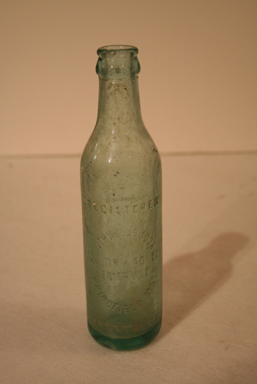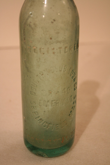 Glass bottle - greenish colored glass, thick. Pronounced pontil mark on bottom. Short narrow neck with lip. Raised lettering "Registered/Country Club Soda Co./38-41/Emery St./Springfield, Mass" and along bottom "Cont. 7 1/2 Fl. Ozs"
