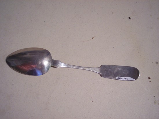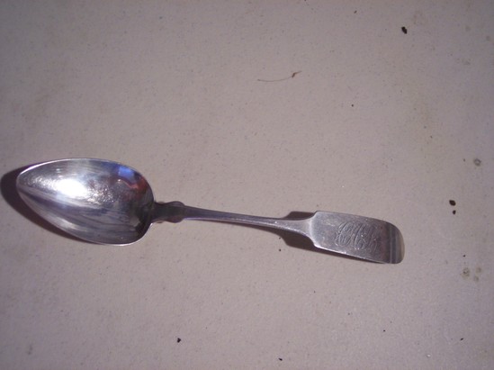 Silver tablespoon, large oval bowl and rectangular shaped end of handle. Engraved "CAB" in script. Hallmark "RM" in serrated rectangle on back.