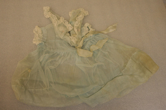Doll's party dress of robbins egg blue starched silk made with shirred skirt attached to high waisted bodice with cap sleeves. A bertha style collar covers the bodice and sleeves. Both are edged with cotton lace. Collar trimmed with floral embroidery appliques on cotton net. Ribbon ornament passes through collar to hang in two streamers down front.