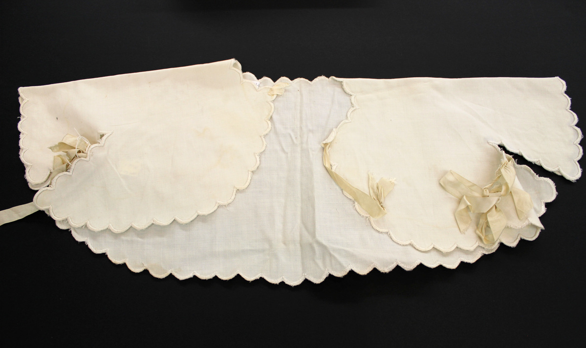 White linen child's cape; embroidered scalloped edges; ribbon ties on sides to create armholes; ribbon tie in front