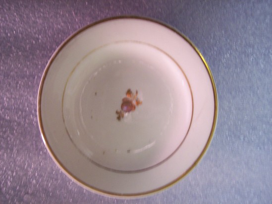 Small, white round plate with gilt line rim and inner circle with a small, gilt floral spray in the center of the plate. Wide foot rim.