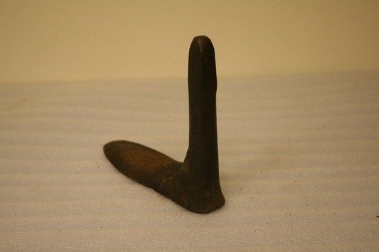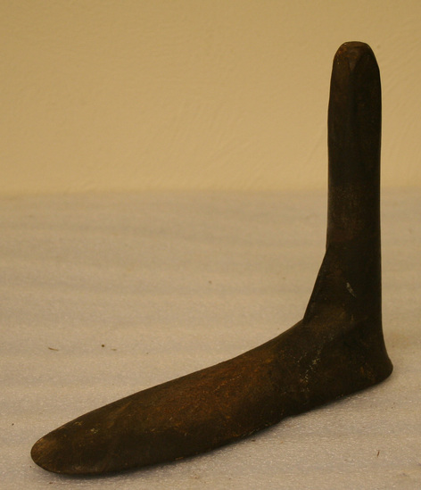 Iron shoe last with square-shaped shaft. The oak shaft is bounded with a wrought iron band at top an dhas a hole drilled into it which the square end of the iron last fits.