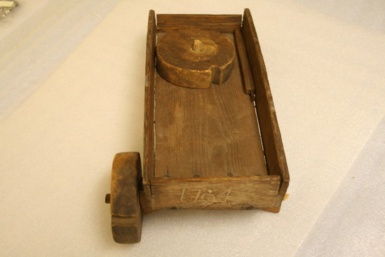 Wooden toy cart - shallow sides. Two round wheels on back and stick attached to front to pull cart. The sides of the cart are made of oak, the bottom is chestnut. Sides are nailed together. In the rear are two thick pine wheels on a wooden axle and held at ends by pegs. Front and rear have wooden yoke braces. The front one has an iron eye into which is hooked a handle. The wheels have each a notch, probably to run a stick through as a break. "1794" scratched into one side of cart.