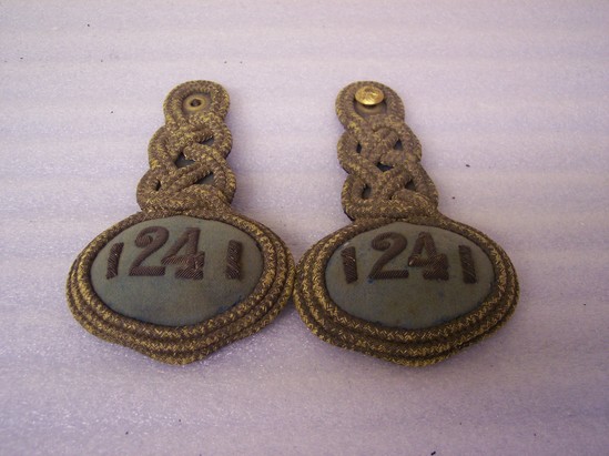 Pair of epaulets. Blue wool with three strands of thick gold rope braided over body of trim along edges. "24" stitched in thread on pad of each. Underside lined with black wool. Brass bracket with clasp on underside. Stamped on bracket "Horstmann/Phila"