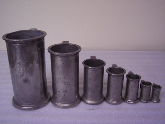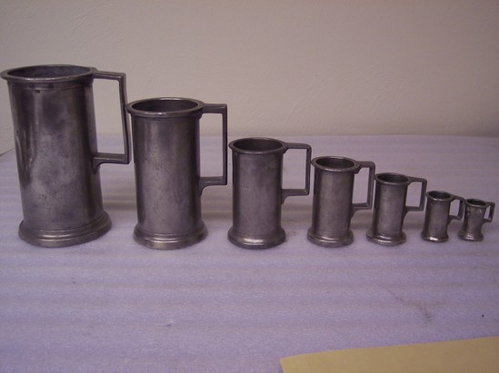 All have stepped bases and cylinder bodies with squarish "C" handles. A. 7 1/8" LITRE; B. 6 1/4" LITRE; C. 4 1/4" DOUBLE DECILITRE; D. 3 1/2" DECILITRE E. 2 3/4" DEMI-DECILITRE F. 2" DOUBLE CENTILITRE G. 1 5/8" CENTILITRE.
