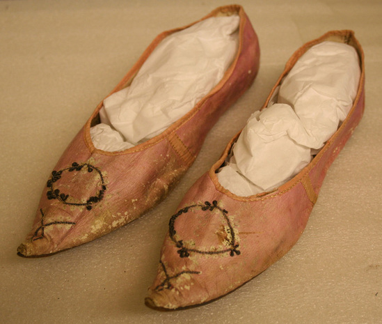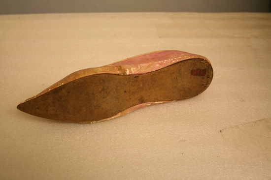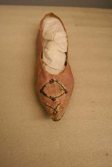 Pink kidskin (leather) shoes; interior lined with linen; silk tape binding; leather insole and interior of heel lined with leather; design made of metallic thread, beads, and spring on top of toe; no heel shoe is flat; pointed toes