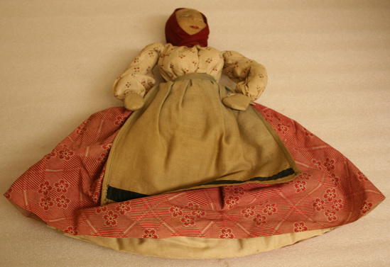 Soft cloth body doll dressed in peasent clothing - red gingham skirt with quilted petticoat, apron, white long sleeve shirt with kerchief around head. Real hair on head. Cloth face with features painted onto doll. Torso and arms are stuffed but there is not body underneath skirt. Fahioned to act as a tea cozy.