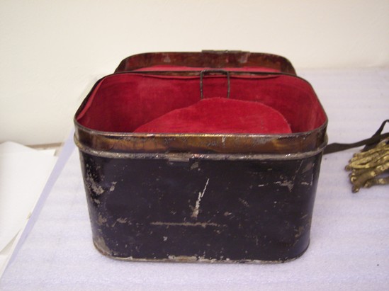 Pair of gold epaulets with silver anchor and rope on outer top portion of each. At the inner end is a gold button on each. The undersides of the epaulets are dark blue. Hanging from the ends of the epaulets are circular coiled strands of gold colored metal. Box is rectangular metal, painted black. Hinged lid Inside lined with red velvet. Raised oval shaped section in middle of box so epaulets rest in the correct position during storage.