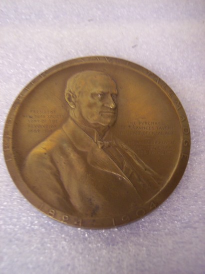 Round bronze medal with smooth, raised edge. Front side has bust of Frederick Samuel Tallmadge in center. "Frederick Samuel Tallmadge" printed around central image. To left of bust "President/New York Society/Sons of the/Revolution/1884-1904" To the right "The Purchase/of Fraunces Tavern/His Last Official Act" and "His Will Generously/Provided Means/For Payment" Printed underneath bust "1804-1904" Back of medal has a image of Fraunces Tavern, inscribed underneath image "Fraunces Tavern/New York" Printed around edge of medal "here Washington Bade Farewell to His Officers 4 December 1783" Underneath image of building on rim "Became the Owner 29 July 1904" Printed on banner arching over building "Here Sons of the Revolution organized 4 December 1883"