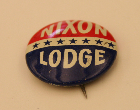 Round button with stick pin on back. Top half red, white line in center with line of blue stars, bottom half blue. In white lettering "Nixon/Lodge"