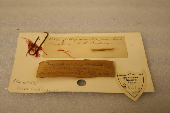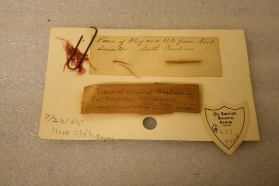 Rectangular piece of flagstaff and small piece of red fabric from the flag that was surrendered at Fort Sumter, SC on April 13, 1861. Both pieces are mounted on a 4" x 6" notecard with brief history written on card
