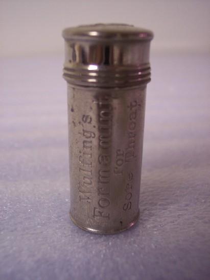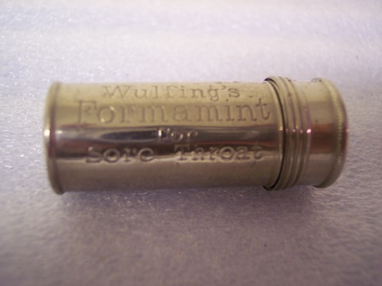 Metal tube with screw top lid. Engraved on the side "Wulfing's Formamint for Sore Throat" Raised on top of lid "Formamint/*"