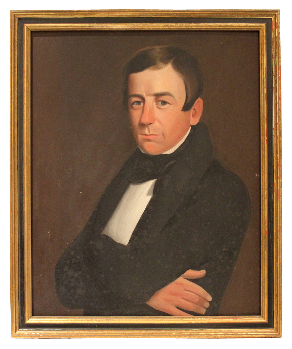 Oil on canvas painting of an unidentified man. 1/4 length image, head facing front, body turned to the left, arms crossed in front of his chest. Rectangular image, man with hazel eyes and brown hair, wearing a dark suit, white shirt and black cravat.