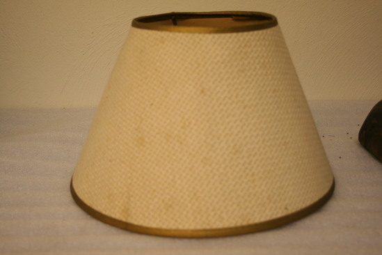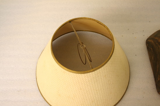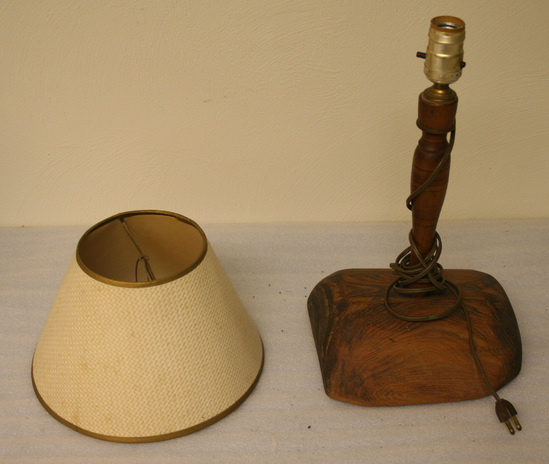 Electric table lamp - wood, made from the wood of the whipping post elm after the tree fell down. The body of the lamp is hand turned with a large rounded bottom. The underside of the bottom is lined with green felt. Metal piece at top of lamp for light bulb to be inserted. Cream colored paper shade.