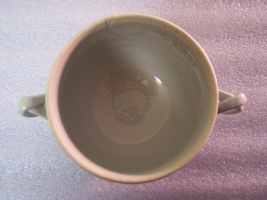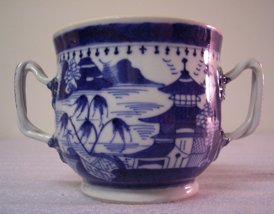Sugar bowl (without lid -- may have been purchased by the museum without a lid or may never have had a lid) that is pot-bellied and has two, two-strand woven handles on either side. Decorated with an Asian scene of two houses, trees, and birds.