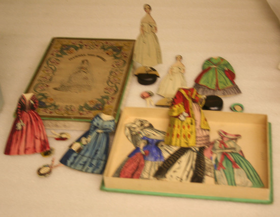 Two paper dolls, exactly alike, printed back and front with half circle bases at foot which fit into a slot on round, turned wooden stands. The costumes are also printed front and back and slip over doll. There are eight dresses and seven bonnets. All are stored in a cardboard box labeled "Journal Des Modes"