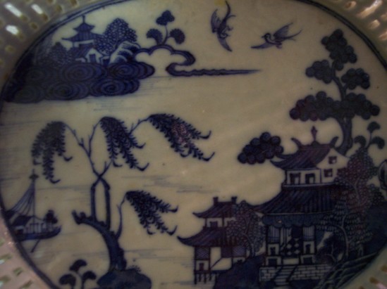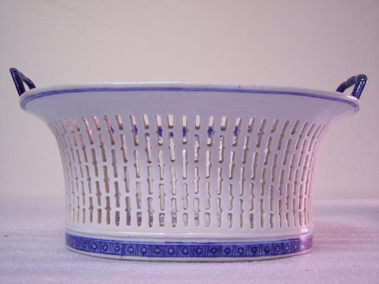 Pierced ceramic, tall-sided basked with two handles. Decorative blue design on rim and base. Inside base has Asian scene of two houses, trees, and birds.