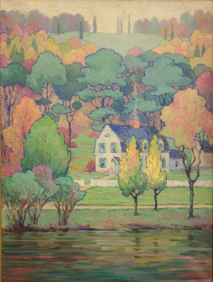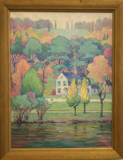 Oil on canvas landscape scene. White house with green shutters, black roof with center chimney. Smoke rising from chimney. Water in foreground. House surrounded by trees with fall foliage however artist used pinks and purples to express color changes in some trees. Landscape elevates in background. Framed in wood frame painted dull gold color.