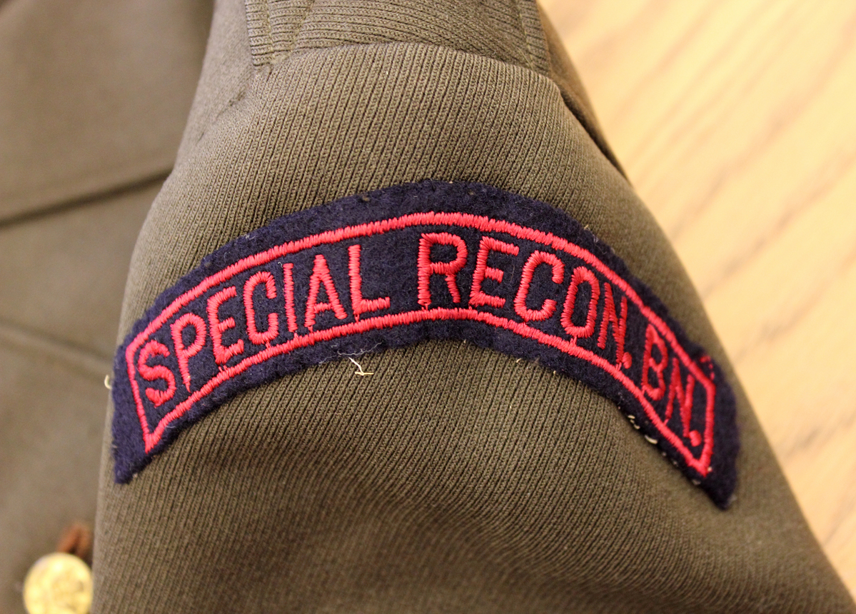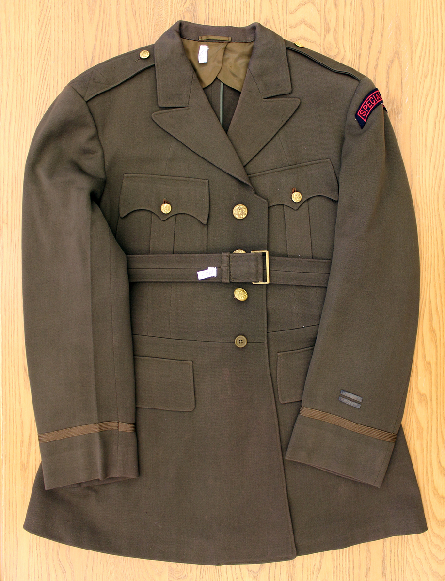 a: Jacket - Dark olive green dress jacket; single breasted; American eagle brass buttons; seam at waist with loops for belt; two patch pockets with flaps at breast; two inset pockets with flaps at waist; epaulettes with buttons on shoulders; no interior pockets; braid around cuffs and two silver bars on left arm. Insignia on left shoulder/upper arm - ARC, red on black background "Special Recon. BN" b: Pants - dark olive green dress pants; inset seam pockets; inset back pockets with one button; button fly; waist band with belt loops c: Belt - simple olive green belt with brass slide through buckle; to be worn with 1992-29-1a