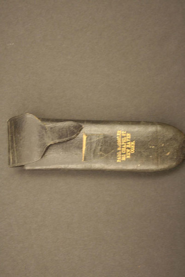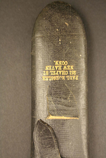 Small oval lenses with double hinged bows with round loops at ends. Case is hard cardboard covered with black leather, flap at one end. Impressed on case "Paul R. Jessler/251 Chapel St./New Haven/Conn"