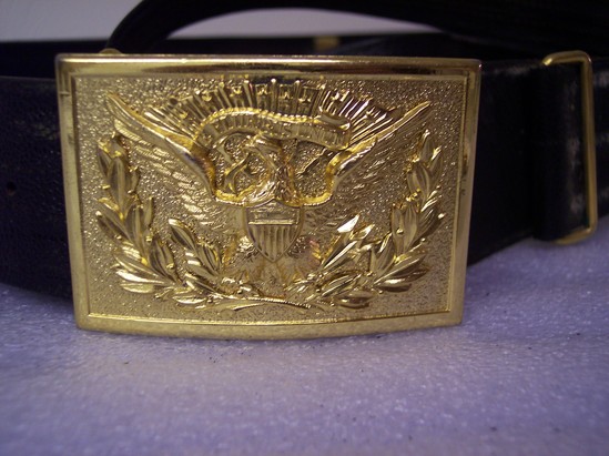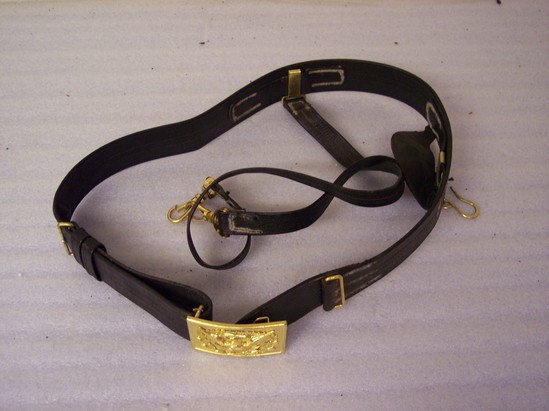 Black leather sword belt with oblong buckle with brass seal of US
