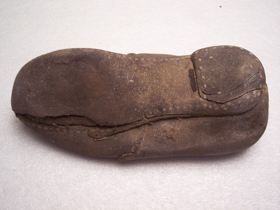 Brown leather shoe with leather sole. Shoe has leather tie on top of shoe. Tied in knot - slipped through one hole on each side of shoe. Bottom of shoe is leather with small iron tacks around base of shoe