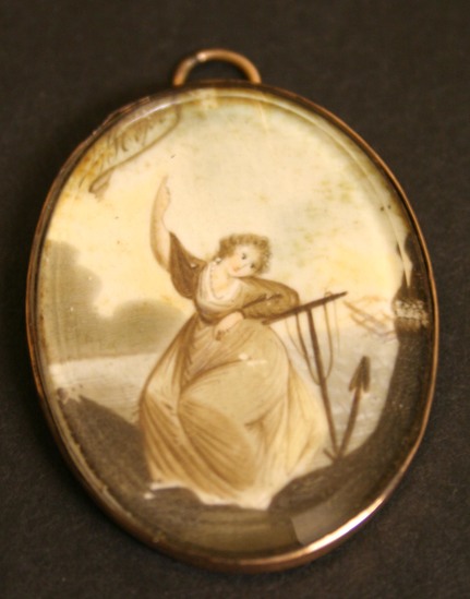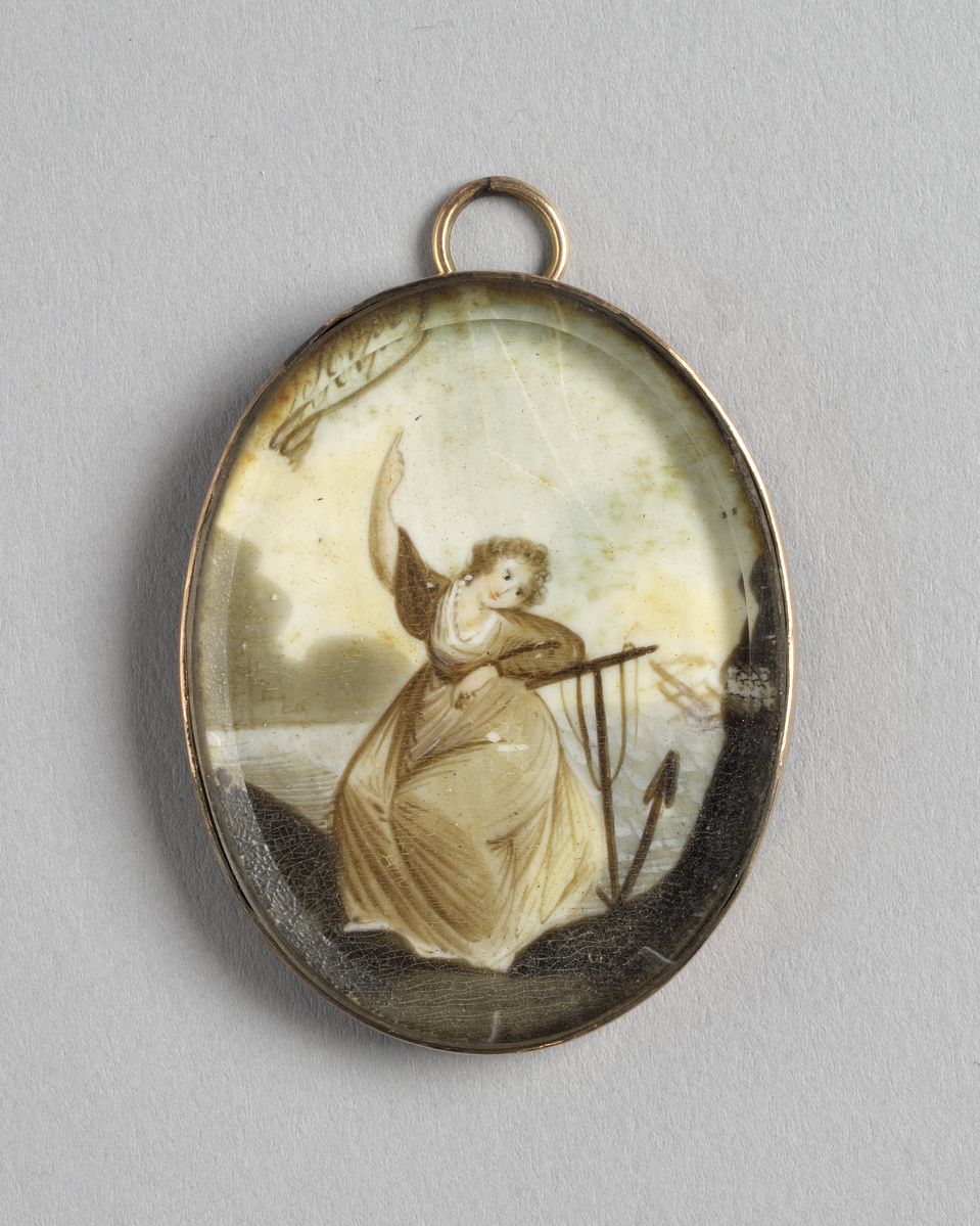 The miniature depicts a well-known, late-18th century mezzotint engraving entitled "Hope" and depicting an allegorical female figure. A number of period variations can be seen today, some of which include a verse at the bottom, "Bless’d Hope will surely lend her Aid, / When most of comfort we’re afraid, / Do not despair Tho’ World’s may frown, / For Virtue shall with Joys be Crown’d."
