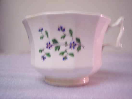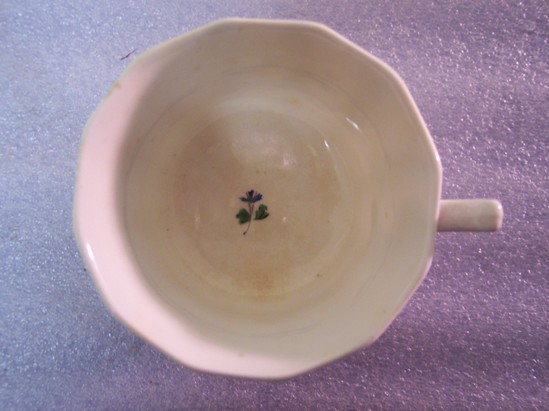Tea cup in the Barbault pattern -- blue and red flowers with green leaves. Marked 2/81 on the base. Cup has a 12-sided body and a highly decorative handle.