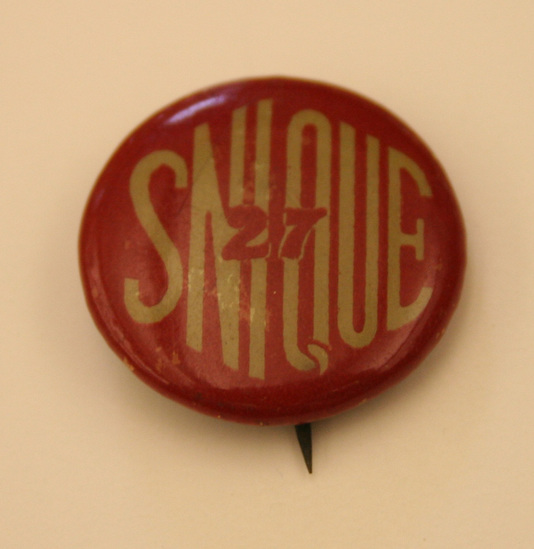 Rusted colored round button with stick pin on back, in tan lettering "SNIQUE" with "27" in center of word.