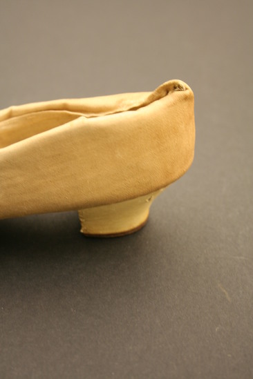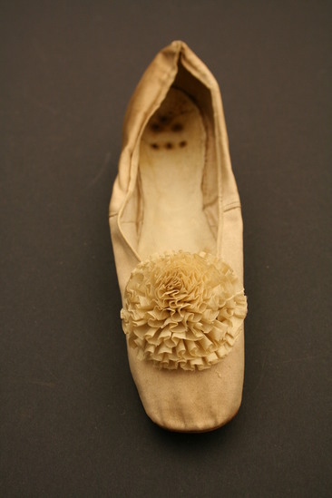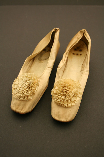 White satin shoes with satin pompoms on front; white leather low heel with brown leather sole; on inside of shoe on side is marked "3 1/2"; each shoe stamped on bottom "Eldridge & Co., Hartford" elastic band at inside of heel on one side