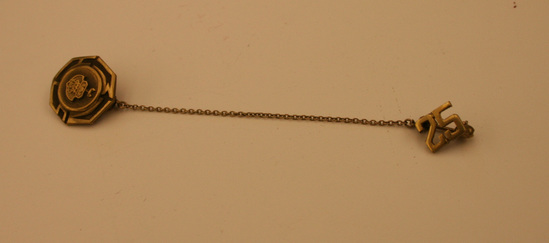 Two small pins, each with their own pin backs, connected by a thin gold chain. Larger of the two is octagonal shape center raised with seal in center. Overlapping letters "M" and "S" Small pin is number "25" "FBD" etched on back of larger pin.