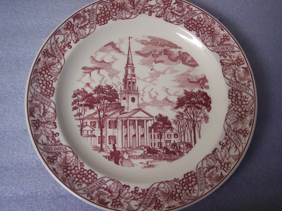 Souvenir plate with maroon transfer design of Congregational Church with border of fruit and leaves and sash of names of Connecticut towns. Plate celebrates the Connecticut's tercentenary celebration as stated on back of plate. 1 of 4 plates with different scenes. Marked "F.W.D., Del." and "PTO."
